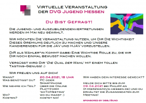 Die Jugend- und Auszubildendenvertretungen werden im Mai neu gewählt. Die DVG Jugend Hessen möchte die folgende virtuelle Veranstaltung nutzen, um Dir die Wichtigkeit dieses Gremiums zu verdeutlichen und unsere Kandidierenden für die JAV und HJAV vorzustellen. Dir als Wähler*in kommt für die Zusammensetzung des Gremiums eine wichtige Rolle zu. Versüßt wird Dir „die Qual der Weiterlesen…